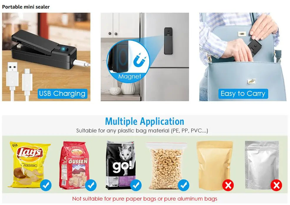 【Breite Anwendung】: Geeignet für die meisten Plastiktütenmaterialien (Papier ist nicht anwendbar), wie z. B. Aluminiumfolien-Heißsiegelbeutel, Plastik-Snackbeutel, Vakuum-Lebensmittel-Aufbewahrungsbeutel, Lebensmittelverpackungsbeutel, PVC-Beutel, können Chips, Snacks und Lebensmittel herstellen bleiben frisch, knusprig, reduzieren Sie Lebensmittelverschwendung.