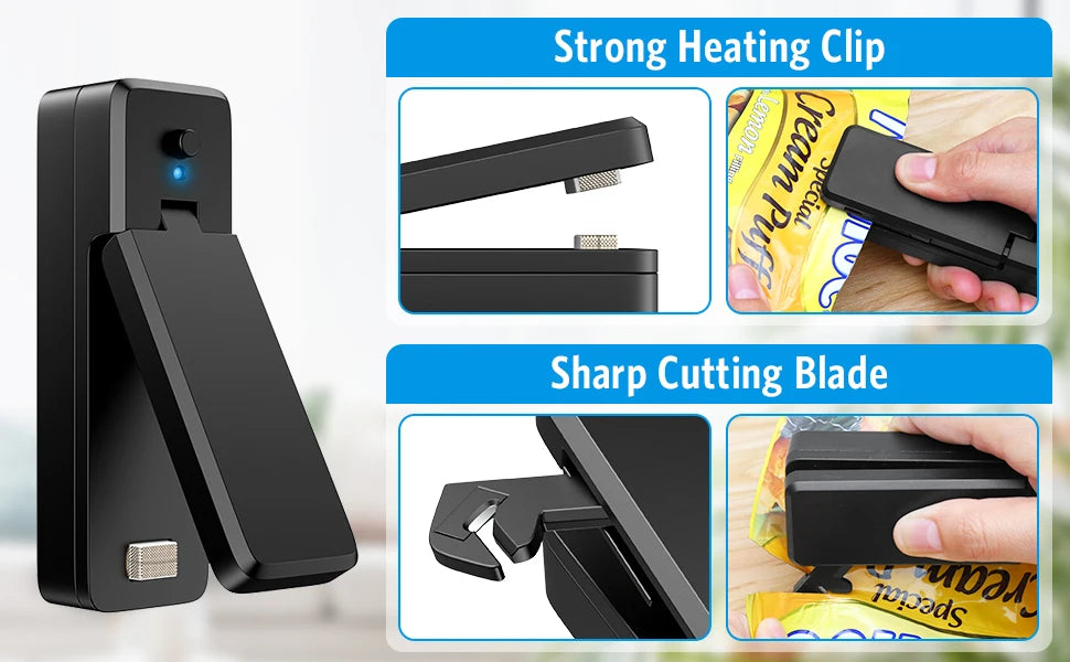 Mini-Beutelversiegelung, 2-in-1-wiederaufladbarer tragbarer Beutel, Vakuum-Wärmeversiegelung und -schneider für Kunststoff-Snack-PVC-Beutel, Picknick-Campagne im Freien